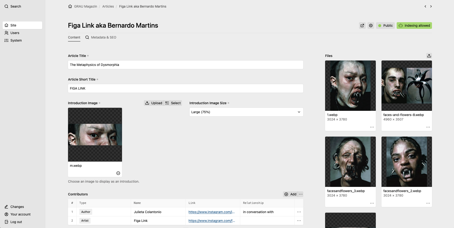 I built a flexible admin interface using Kirby, enabling GRAU’s editorial team to manage all content independently. Editors can publish and update articles, edit metadata, and curate the homepage by selecting featured pieces, customizing thumbnails, and adjusting colors and layout — all without writing any code.